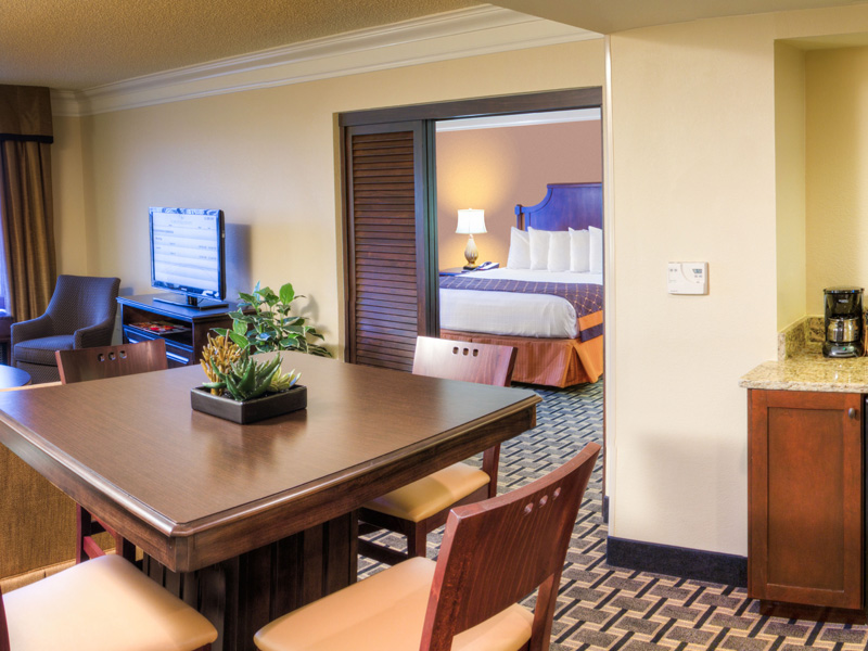 Enjoy a spacious 660 square feet in our Executive King Suite, complete with a wet bar and refrigerator, table for four and a beautifully furnished living space.
